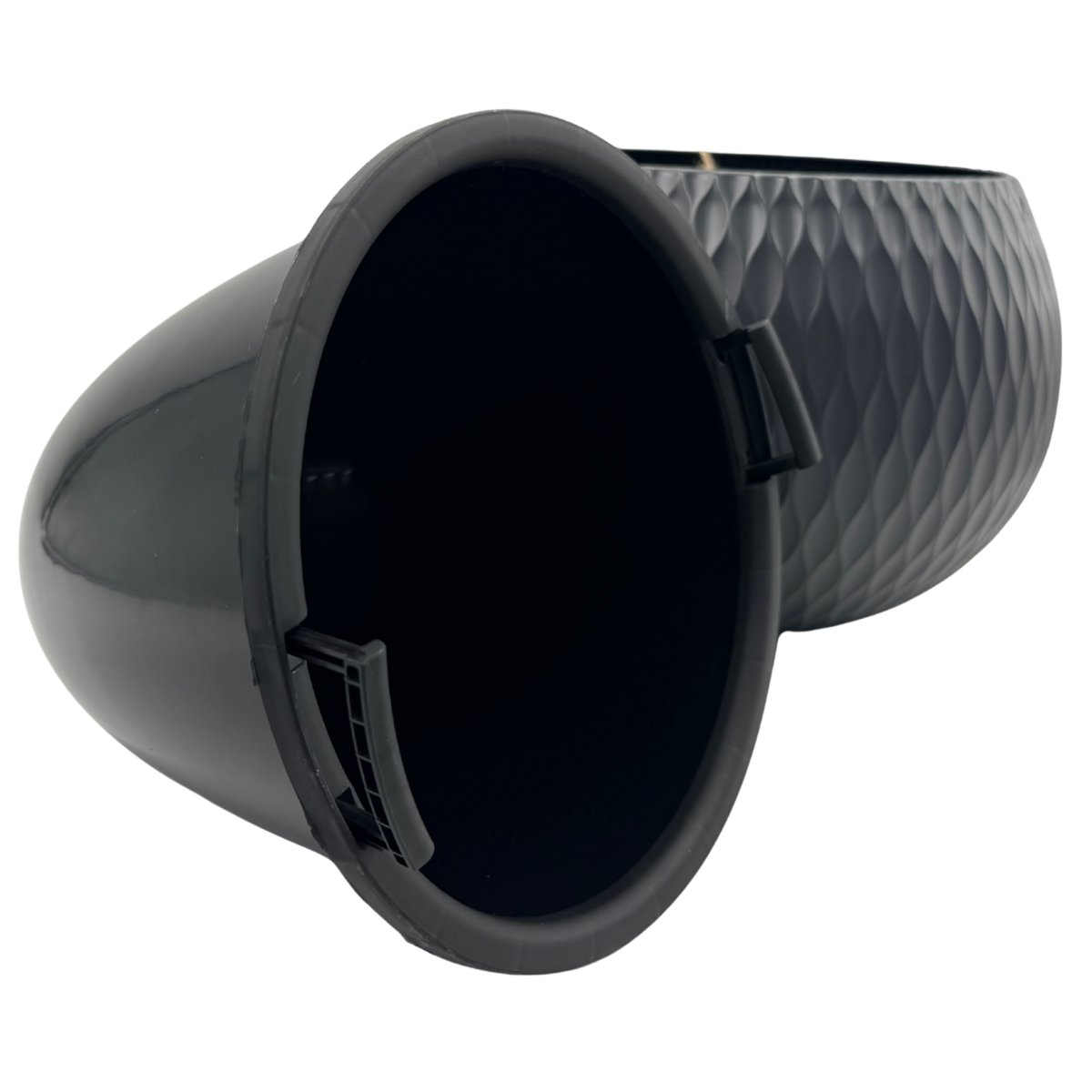 Кашпо выполнено в строгом графитовом цвете, гармонично вписывающемся в любой интерьер. Элегантный внешний вид сочетается с высокой прочностью материала и устойчивостью к воздействию окружающей среды.Удобство ухода и эксплуатации