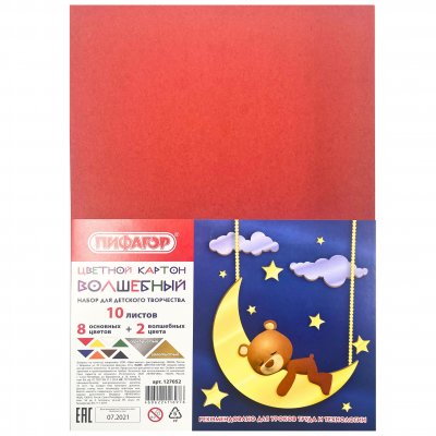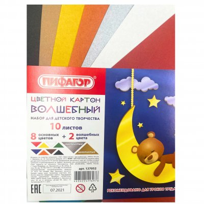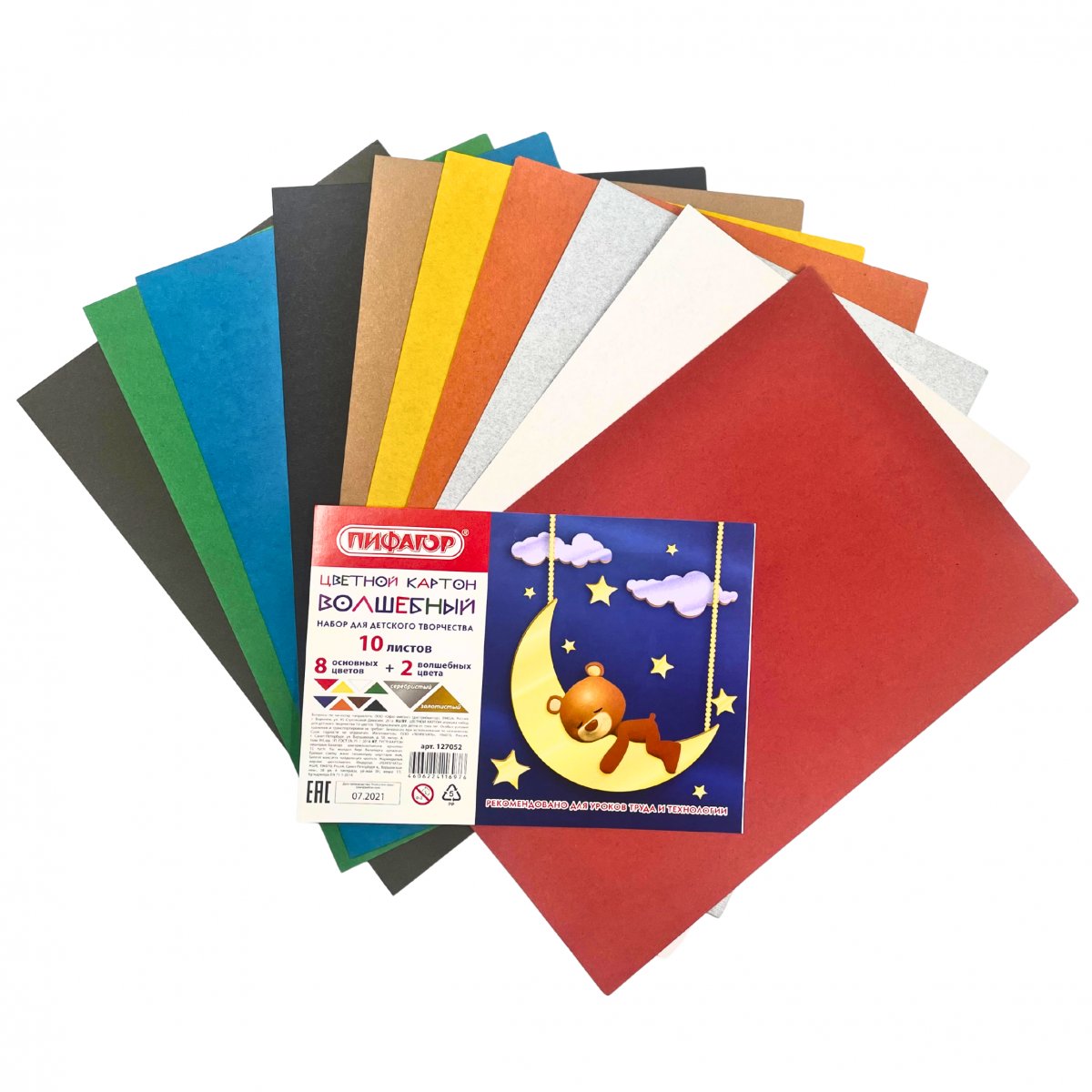 Цветной картон А4 немелованный ВОЛШЕБНЫЙ, 10л., 10цв., ПИФАГОР,200*283мм(127052)/40
