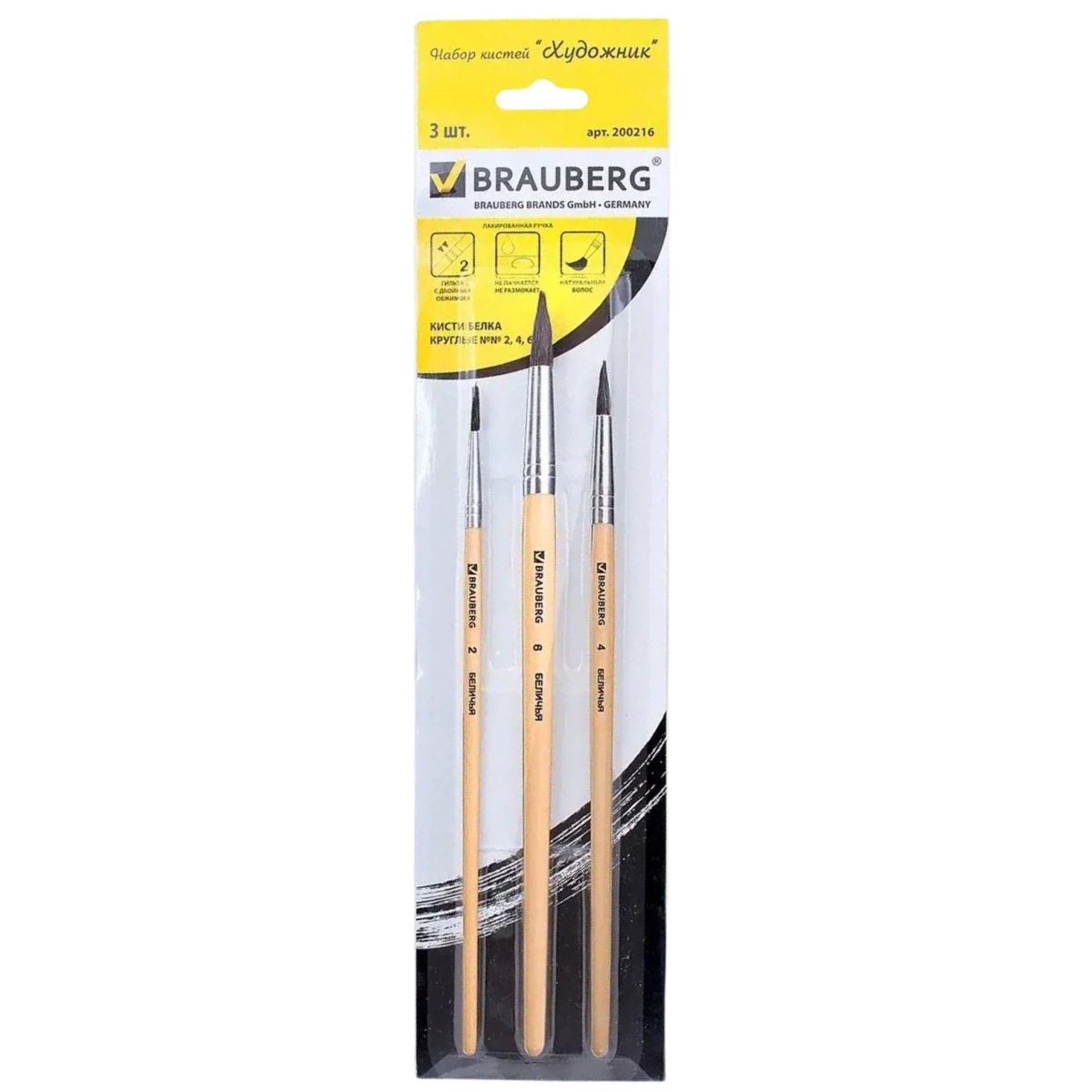 Кисти BRAUBERG, НАБОР 3шт. (беличья круглая №2,4,6)(200216)/12/288