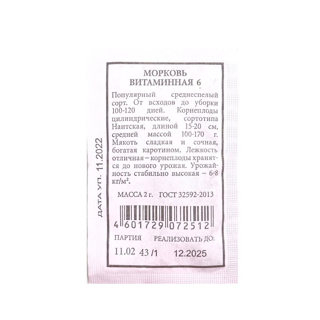Применение: Семена моркови "Витаминная 6" подходят для посадки весной или осенью. Перед посадкой рекомендуется замочить семена на несколько дней, чтобы ускорить процесс прорастания. Посадка осуществляется на глубину около 2 см, с расстоянием между растениями примерно 5-7 см.