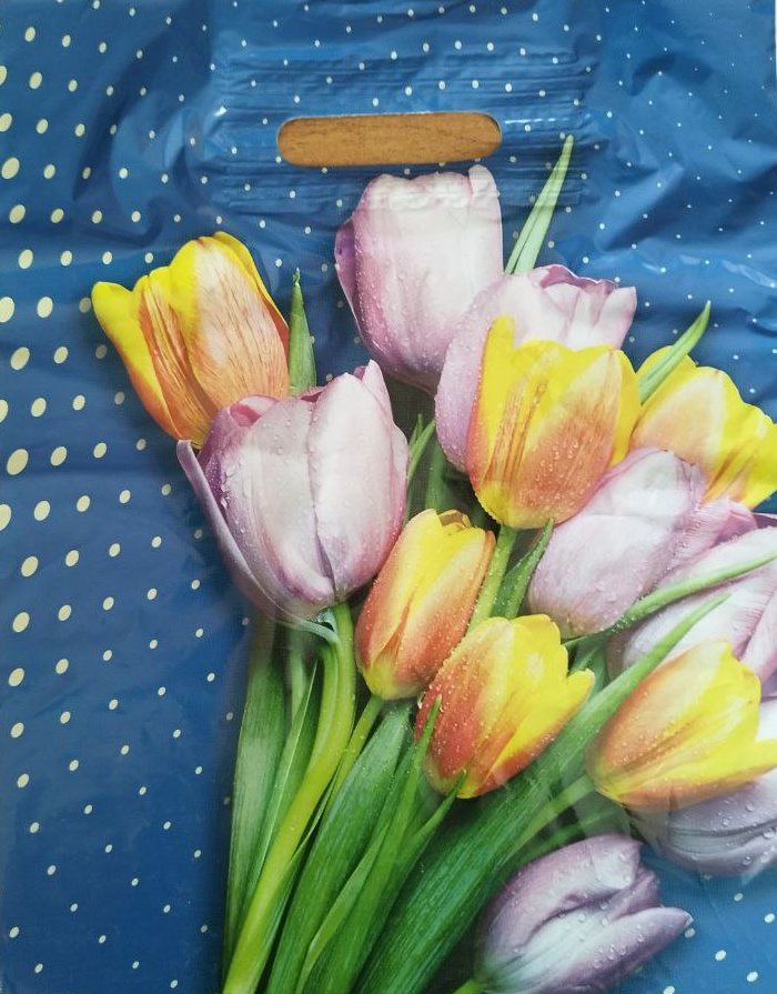 Пакет Тюльпаны на синем с прорубной ручкой — стильный помощник для упаковки!