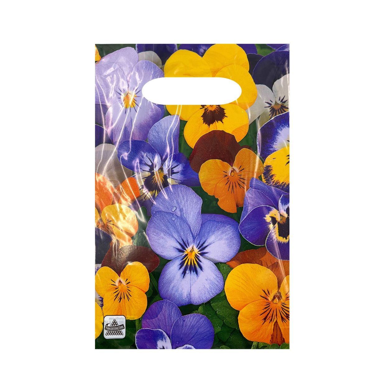 Эта упаковка представляет собой прорубную ручку с рисунком «Анютины глазки». Она выполнена из полиэтилена толщиной 30 мкм и обладает высокой прочностью и долговечностью.