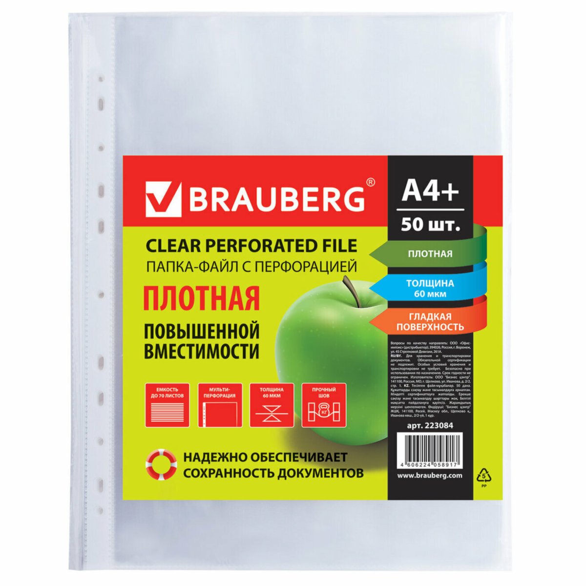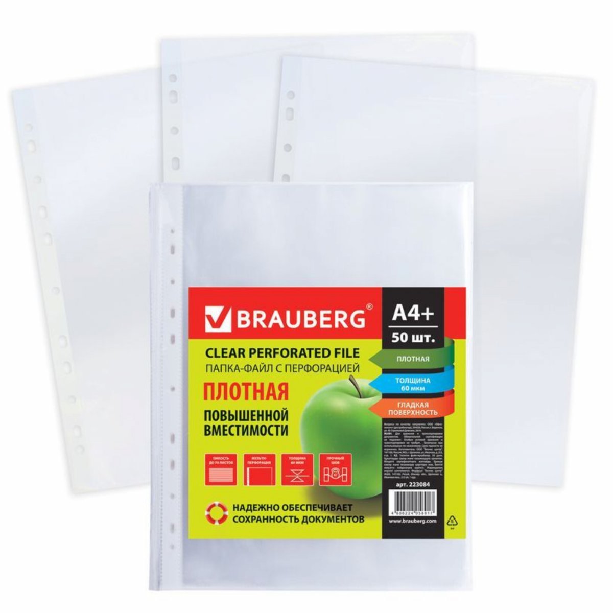 Папки-файлы перфорированные ПЛОТНЫЕ А4+ BRAUBERG, КОМПЛЕКТ 50шт.,60мкм(223084)/6/26
