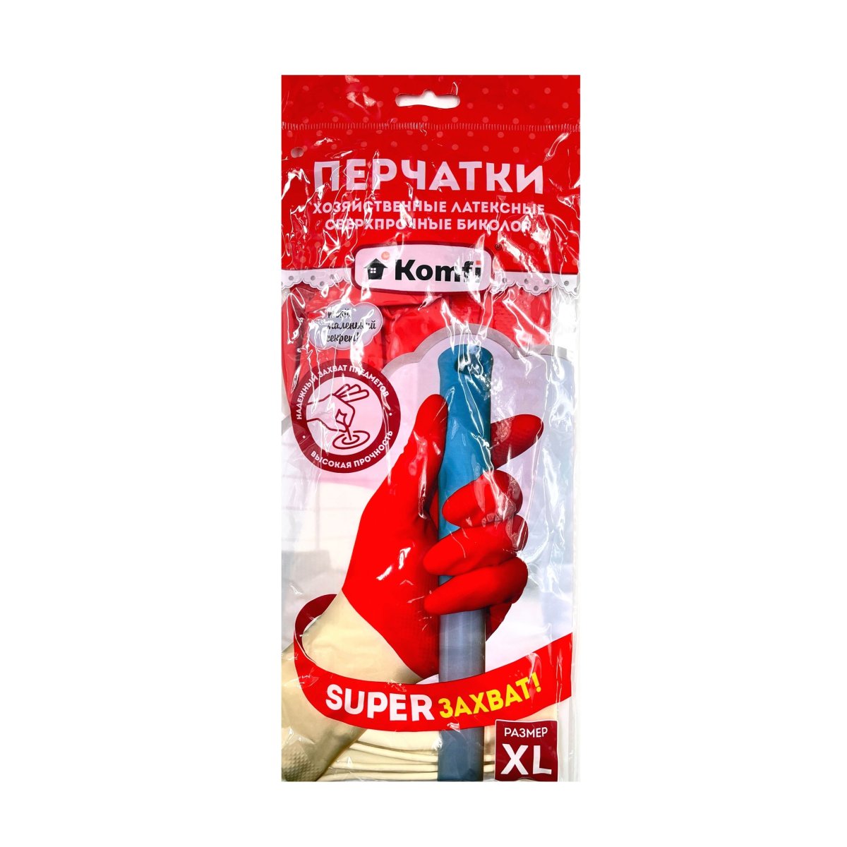 Перчатки хозяйственные латексные СВЕРХПРОЧНЫЕ БИКОЛОР, XL белый+красный(Komfi)/1/12/144
