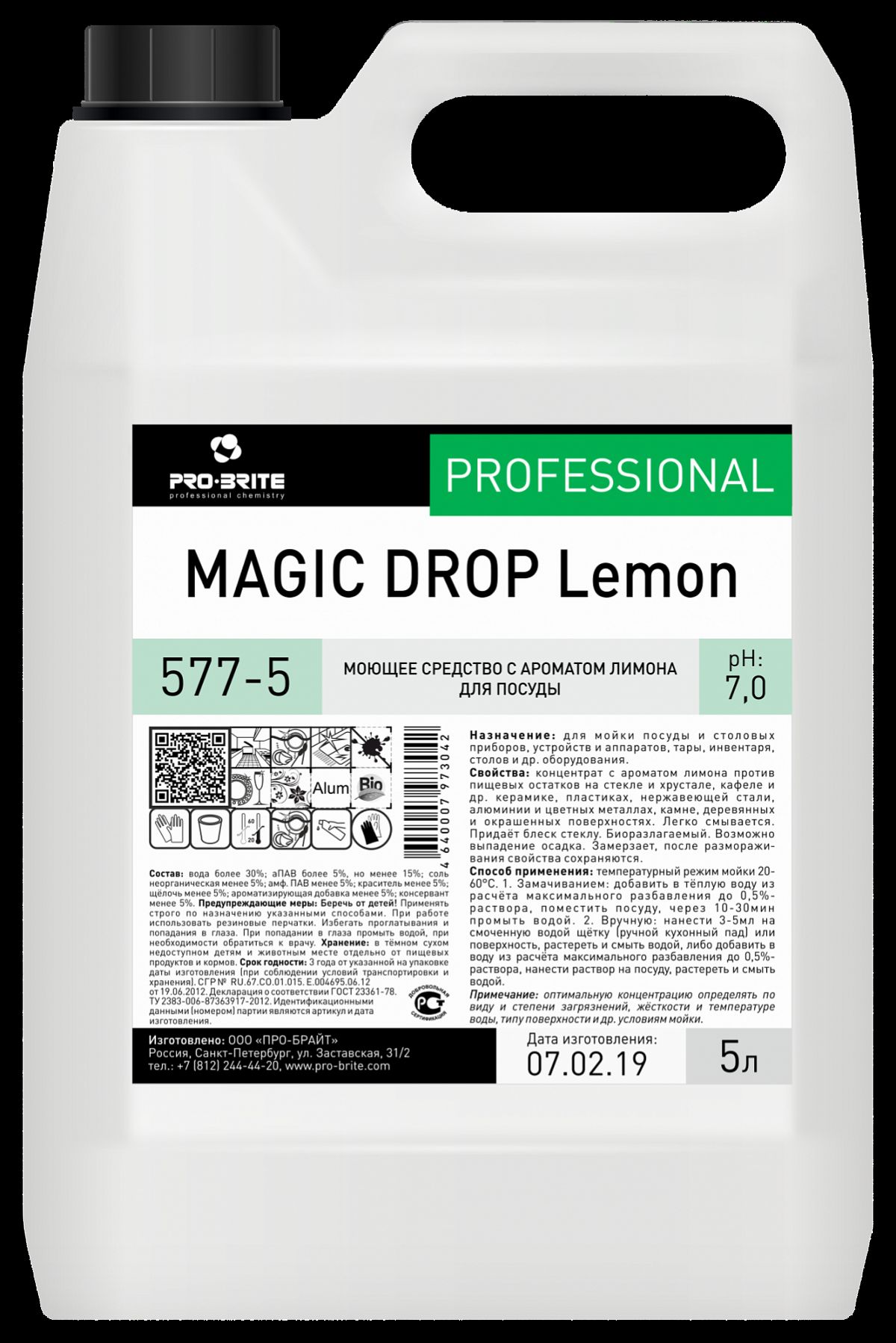 Средство с ароматом лимона для мойки посуды 5 л MAGIC DROP LEMON(PRO-BRITE)(577-5)/4заказ