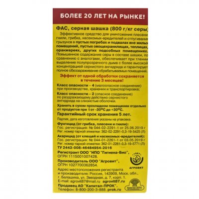 Универсальная шашка серная ФАС 300г предназначена для обработки помещений различного назначения – от погребов и подвалов до теплиц.
