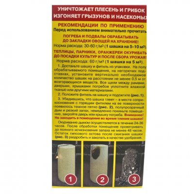Рекомендуется использовать шашку перед закладкой урожая в погреба и хранилища, а также перед началом сезона выращивания растений в теплицах.