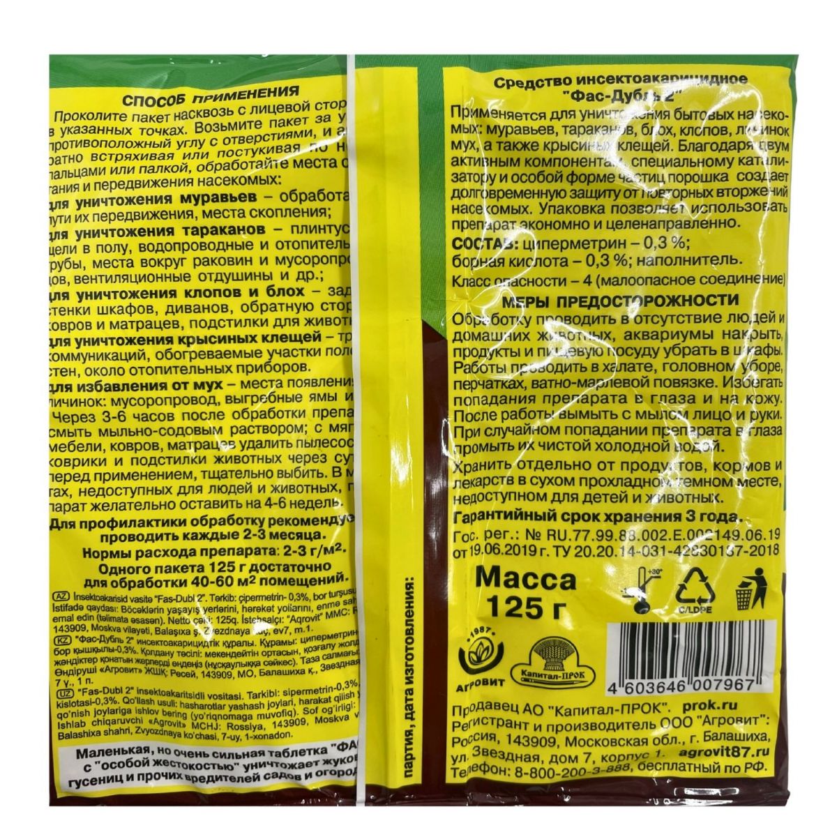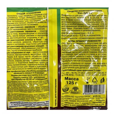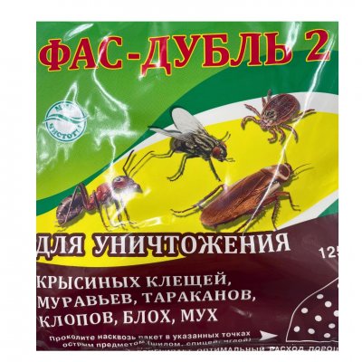 ФАС-Дубль – это эффективный инсектицид широкого спектра действия, предназначенный для борьбы с различными видами насекомых, таких как муравьи, тараканы, клопы, блохи и мухи.