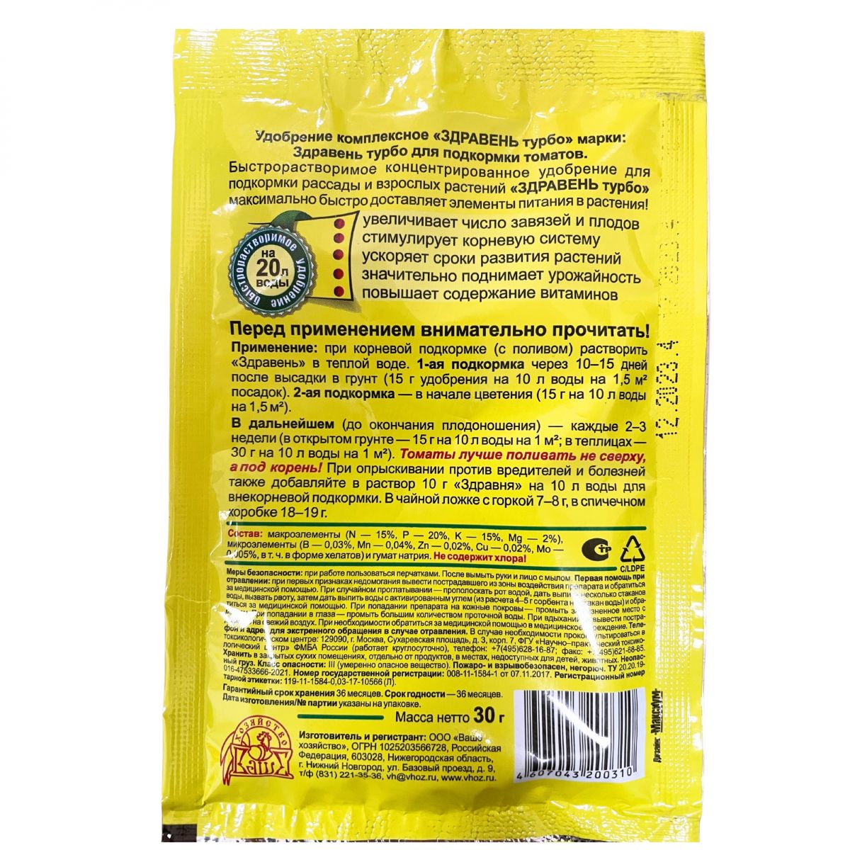 Здравень Турбо подходит для всех видов почвы и климатических условий. Его рекомендуется использовать на этапе высадки рассады, во время активного цветения и формирования завязей, а также в период созревания плодов.Рекомендации по применению: