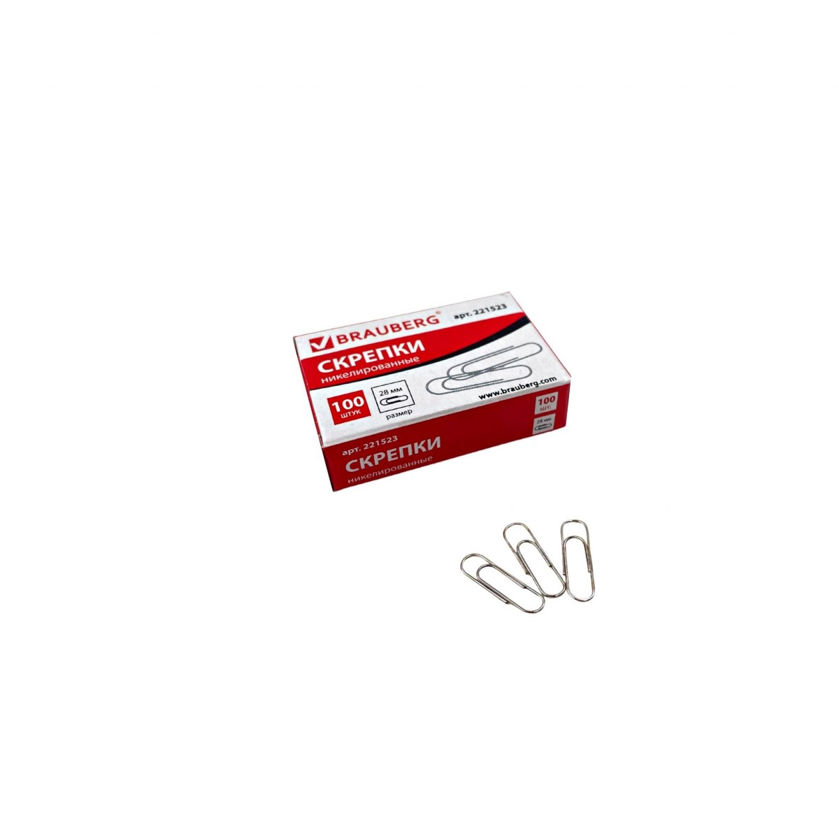 Скрепки BRAUBERG 28мм никелированные, 100шт.(221523)/144