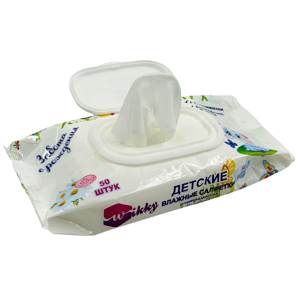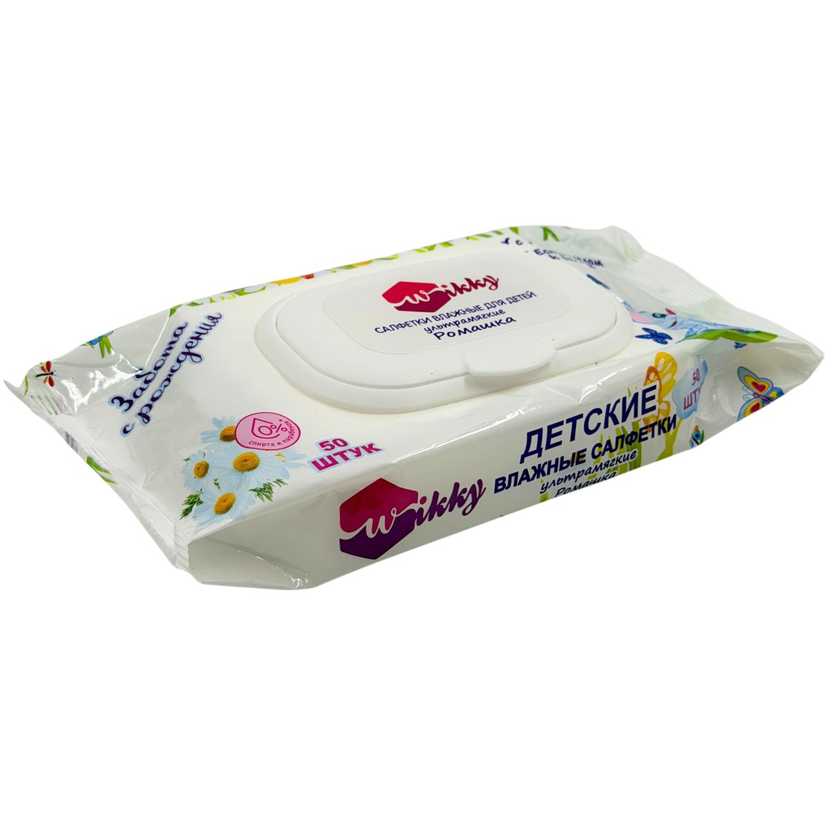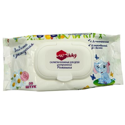 Влажные салфетки Wikky 50 шт с клапаном Детские ультрамягкие ромашка/хлопк 1/24