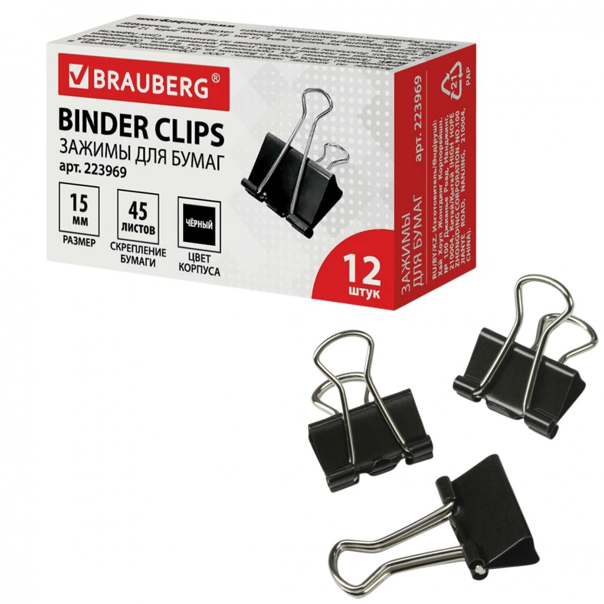 Зажимы для бумаг BRAUBERG, КОМПЛЕКТ 12шт., 15мм, на 45л.(223969)/12/360